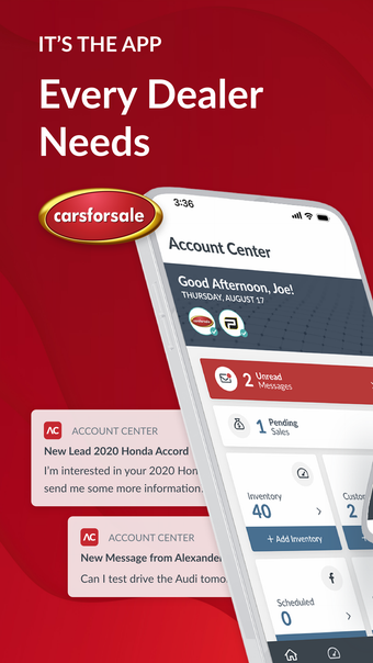Met functies zoals RapidReply Messaging kunnen gebruikers snel reageren op leads en klanten beheren waar ze ook zijn. De app biedt ook de mogelijkheid om klantgedrag te analyseren, telefoongesprekken met leads opnieuw af te spelen en belangrijke bedrijfsstatistieken op één dashboard te bekijken. Met de Carsforsale.com Account Center app hebben dealers alle tools die ze nodig hebben om hun verkoopdoelen te volgen en hun bedrijf efficiënt te beheren.